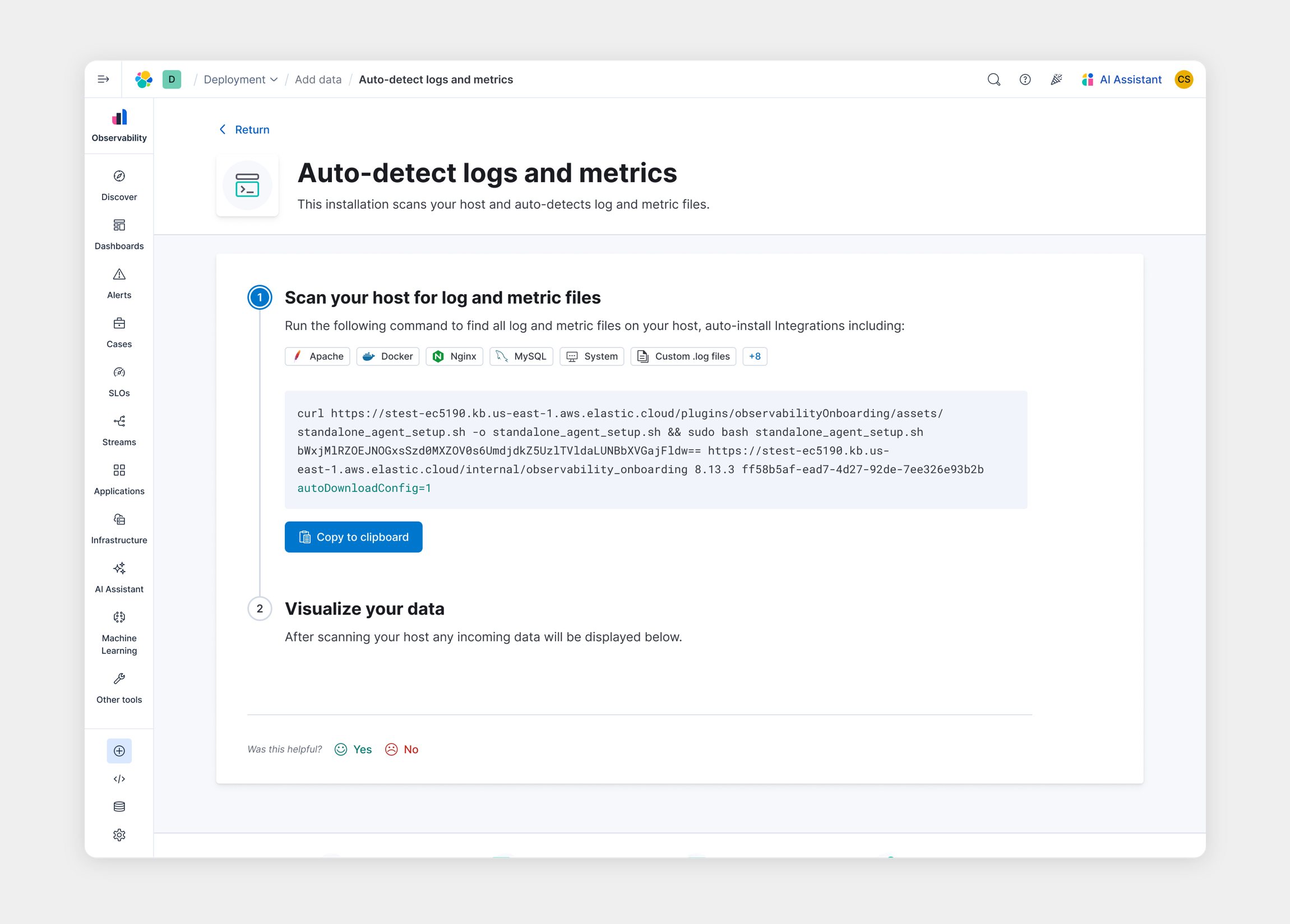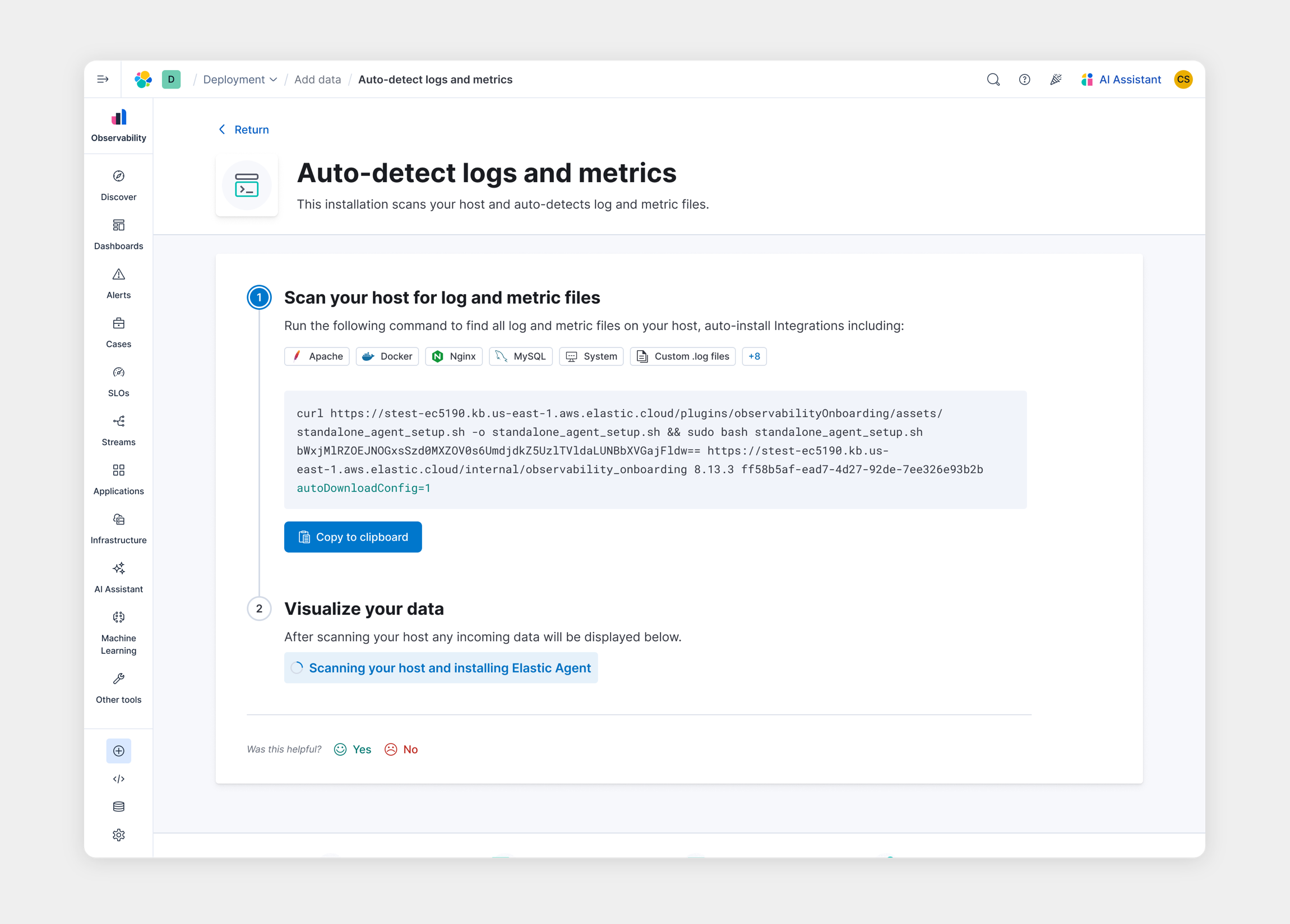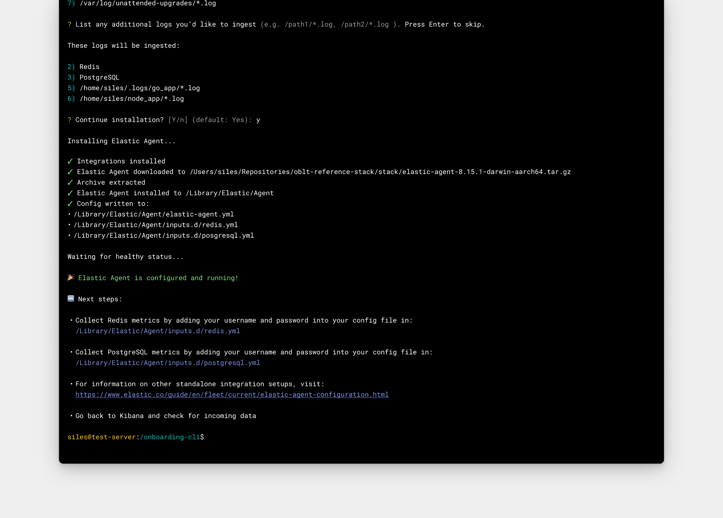 We designed a CLI-driven onboarding experience that scans the user's host for log and metric files, then guides them through a series of questions to configure data ingestion. With a single command, users can detect available data sources, assign them to the appropriate Elastic integrations, and automatically install the Elastic Agent.