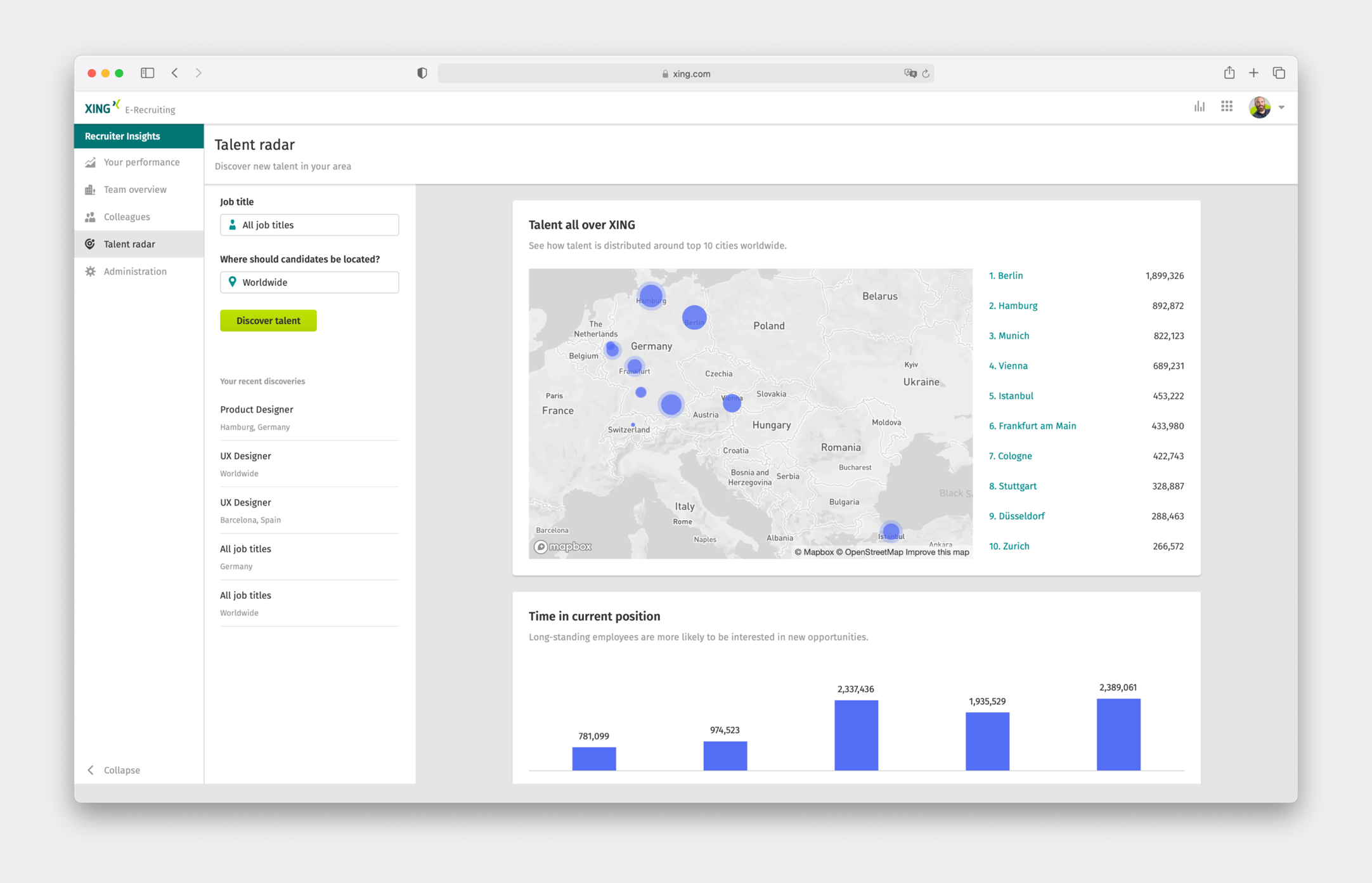 Our users could perform complex candidate searches in XING TalentManager, but they were asking to know more about their potential candidates. To do this, they had to visit candidate profiles one by one, which was a time-consuming task. It was clear we needed a quick way of visualizing more insights about candidates.