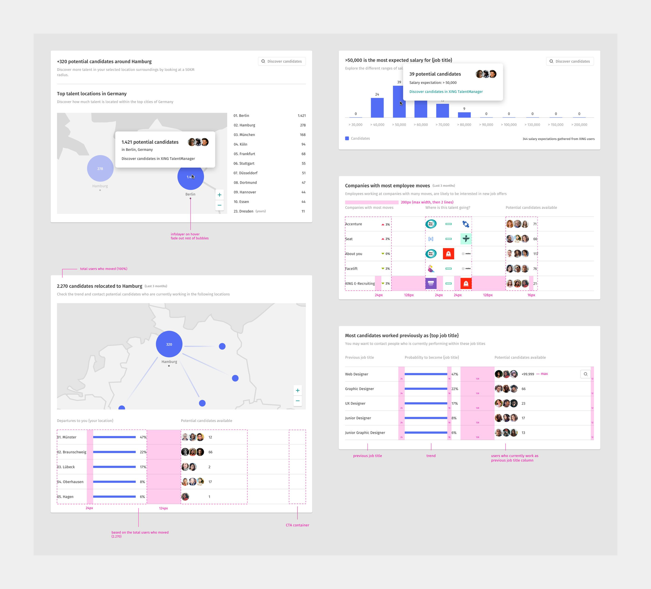 Some of the iterations and new proposals we made during the second phase of user tests. This time I prepared a small prototype where our users could see the entire Talent Radar dashboard with all the widgets.