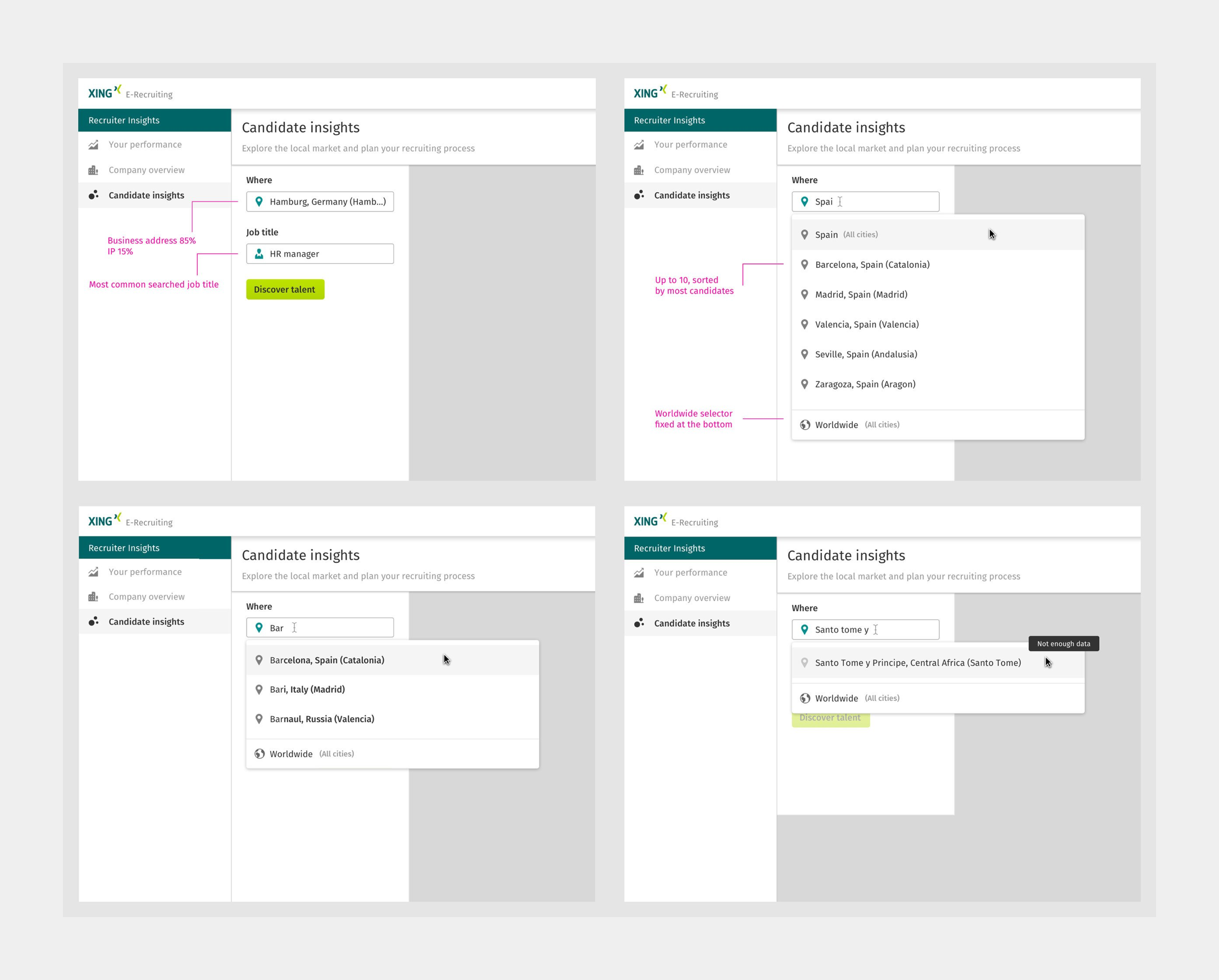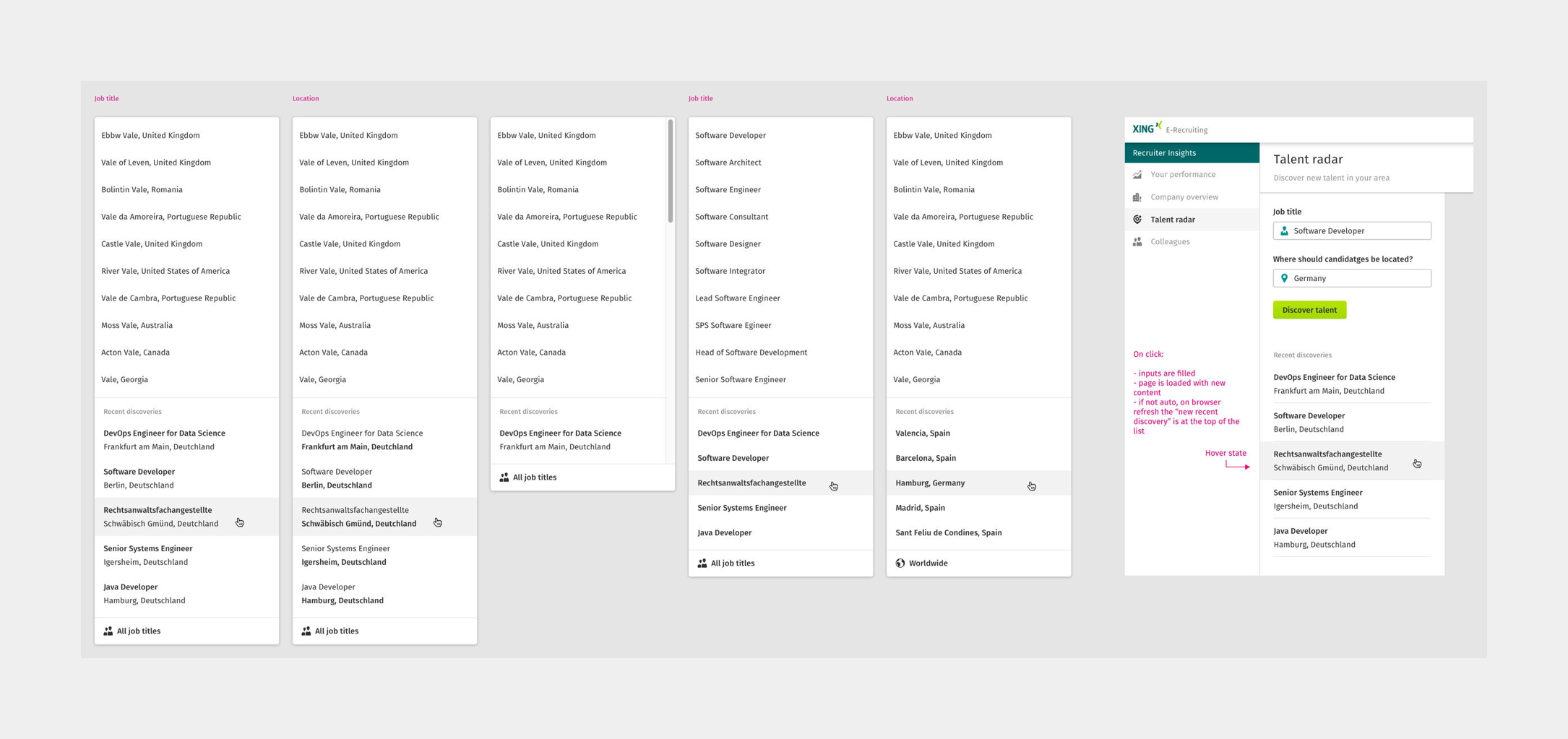I designed two input fields that would auto-suggest results for our users. They can enter cities, countries, and job titles. To search for all job titles, city, or country, I added the entries: All job titles and Worldwide as fixed footers in the auto-suggest dropdowns.
